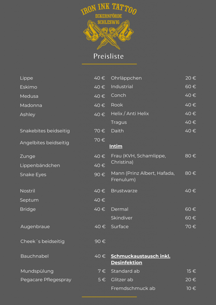 Wir stechen Dir dein Piercing in ruhiger, sauberer Atmosphäre! Nancy und Micha sind erfahrene Piercer mit allen möglichen Nachweisen. Für Piercings brauchst Du bei uns keinen Termin, komm einfach vorbei! Jeden zweiten Samstag im Monat findet bei uns ein Walk in Day statt, hier bekommst Du Tattoos und Piercings zu Special-Preisen!